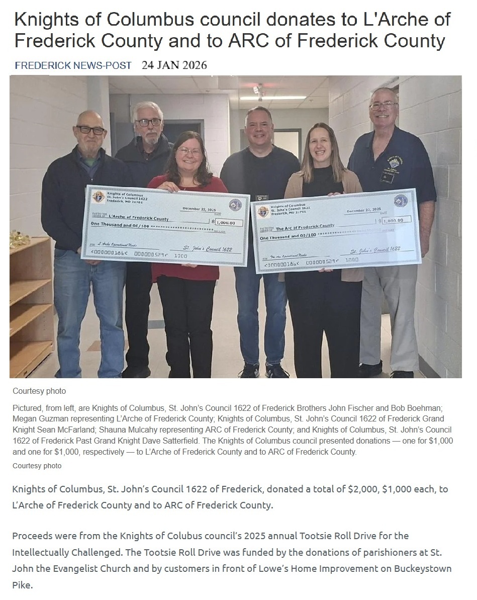 KofC St. John's Council 1622 donated a total of $2000.00, $1000.00 each, to L'Arche of Frederick County and to ARC of Frederick County. Proceeds are from our 2025 annual Tootsie Roll Drive for the Intellectually Challenged, enhanced by a personal donation to achieve the rounded figures. Our Tootsie Roll Drive was funded by the generous donations by parishioners at St. John the Evangelist Church and by customers in front of Lowe's Home Improvement on Buckeystown Pike. Thank you to Lowe's for your support.