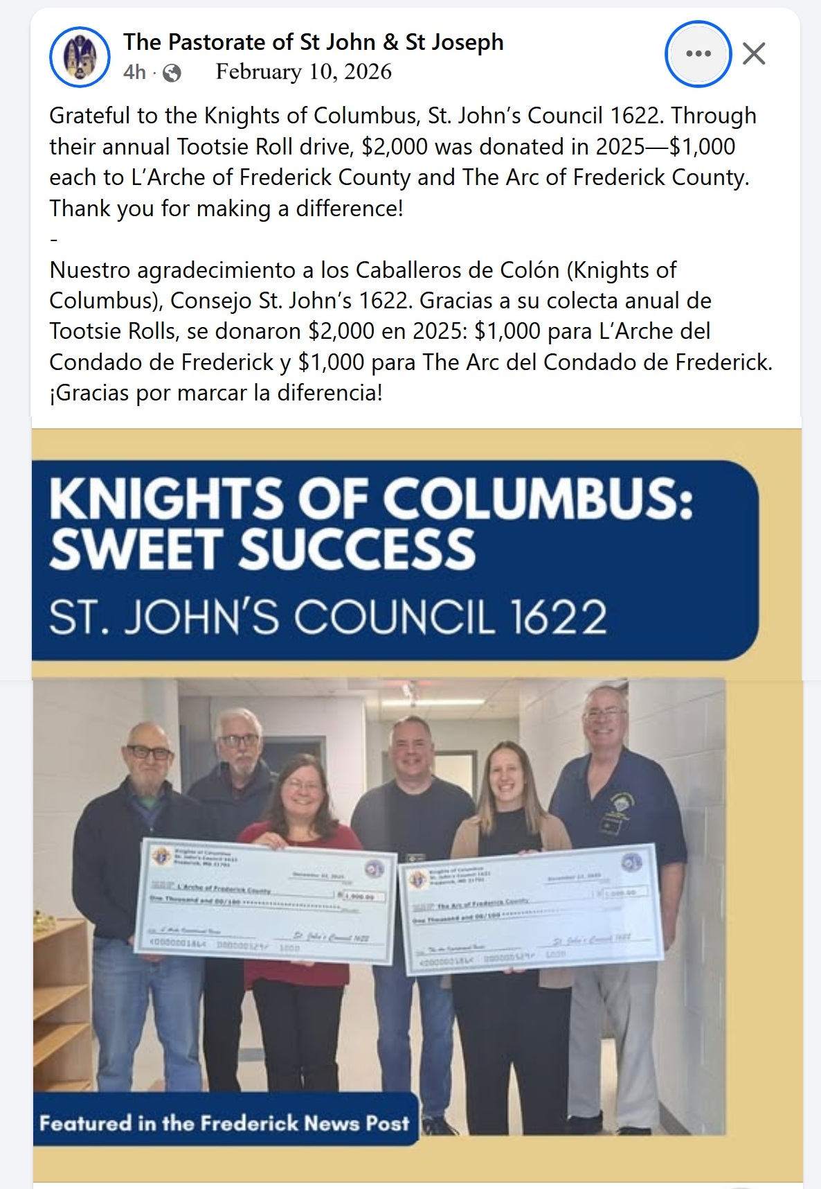 KofC St. John's Council 1622 donated a total of $2000.00, $1000.00 each, to L'Arche of Frederick County and to ARC of Frederick County. Proceeds are from our 2025 annual Tootsie Roll Drive for the Intellectually Challenged, enhanced by a personal donation to achieve the rounded figures. Our Tootsie Roll Drive was funded by the generous donations by parishioners at St. John the Evangelist Church and by customers in front of Lowe's Home Improvement on Buckeystown Pike. Thank you to Lowe's for your support.