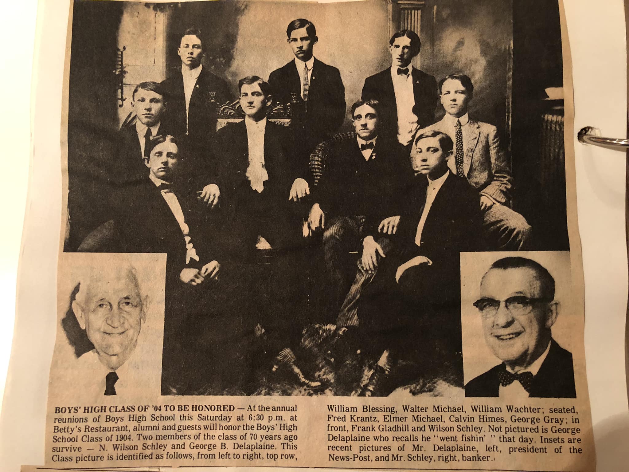 Sometime in 1974. Bishop McNamara Assembly 384 member SK N. Wilson Schley (PGK Cncl 1622) was recognized in a Frederick newspaper article concerning the 1904 class of the Boys High School. A circa 1974 photo of SK N. Wilson Schley is shown in the lower right hand corner. SK N. Wilson Schley was a founding member of the then-named St. John's Assembly 384 in 1916.