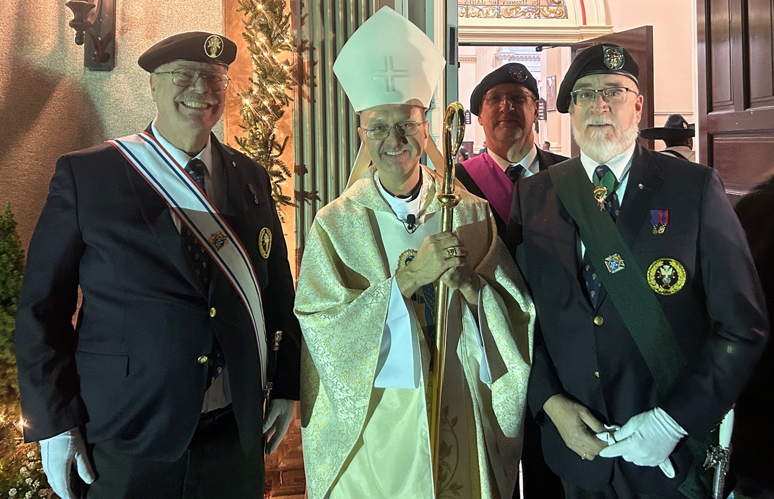 Pictured after the Mass with Bishop Bruce A. Lewandowski, C.Ss.R., Auxiliary Bishop of Baltimore; SK David Satterfield (Cncl 1622}, PFN Walter John Leskuski (Cncl 14011, in rear), and SK Marty Nau (District Marshall, member of Father Michael J. McGivney Assembly 2595).