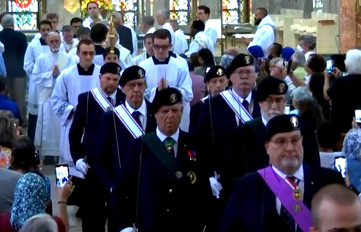 June 6, 2024, The Bishop McNamara Assy 384 color corps and other color corps members serve at National Shrine of Saint Elizabeth Ann Seton in Emmitsburg, MD for the National Eucharistic Pilgrimage. After a Mass in the Shrine by Archbishop William E. Lori, the color corps escort a eucharistic pilgrimage from the Shrine into downtown Emmitsburg and return.