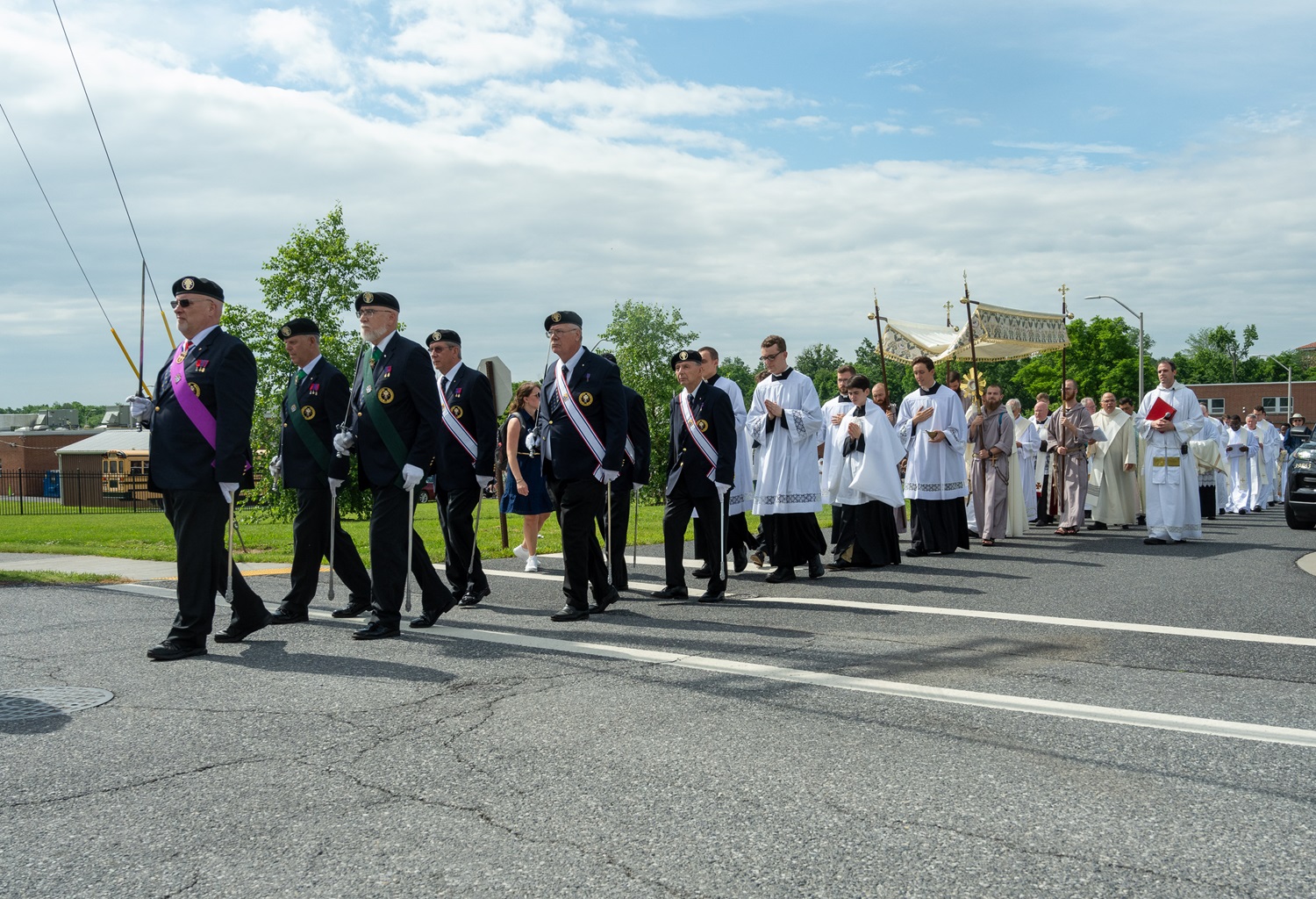 June 6, 2024, The Bishop McNamara Assy 384 color corps and other color corps members serve at National Shrine of Saint Elizabeth Ann Seton in Emmitsburg, MD for the National Eucharistic Pilgrimage. After a Mass in the Shrine by Archbishop William E. Lori, the color corps escort a eucharistic pilgrimage from the Shrine into downtown Emmitsburg and return.