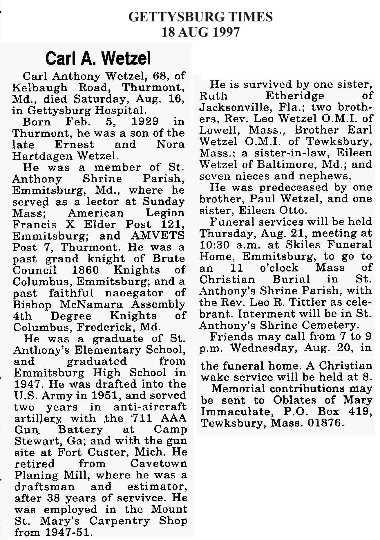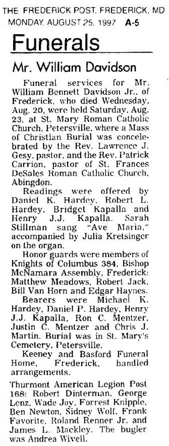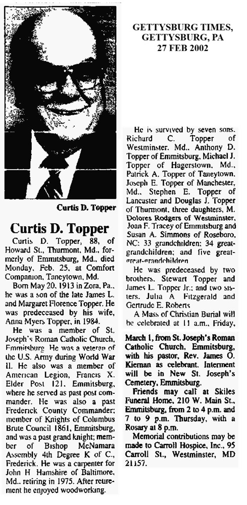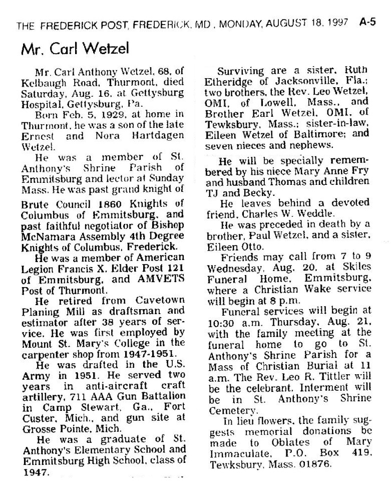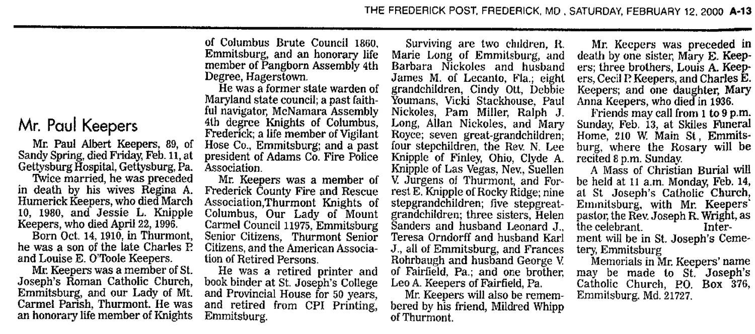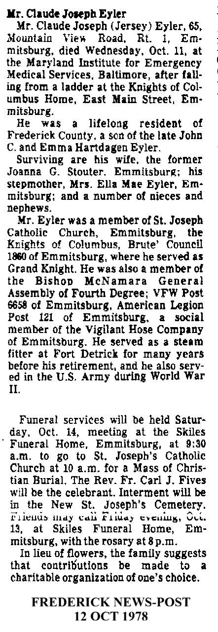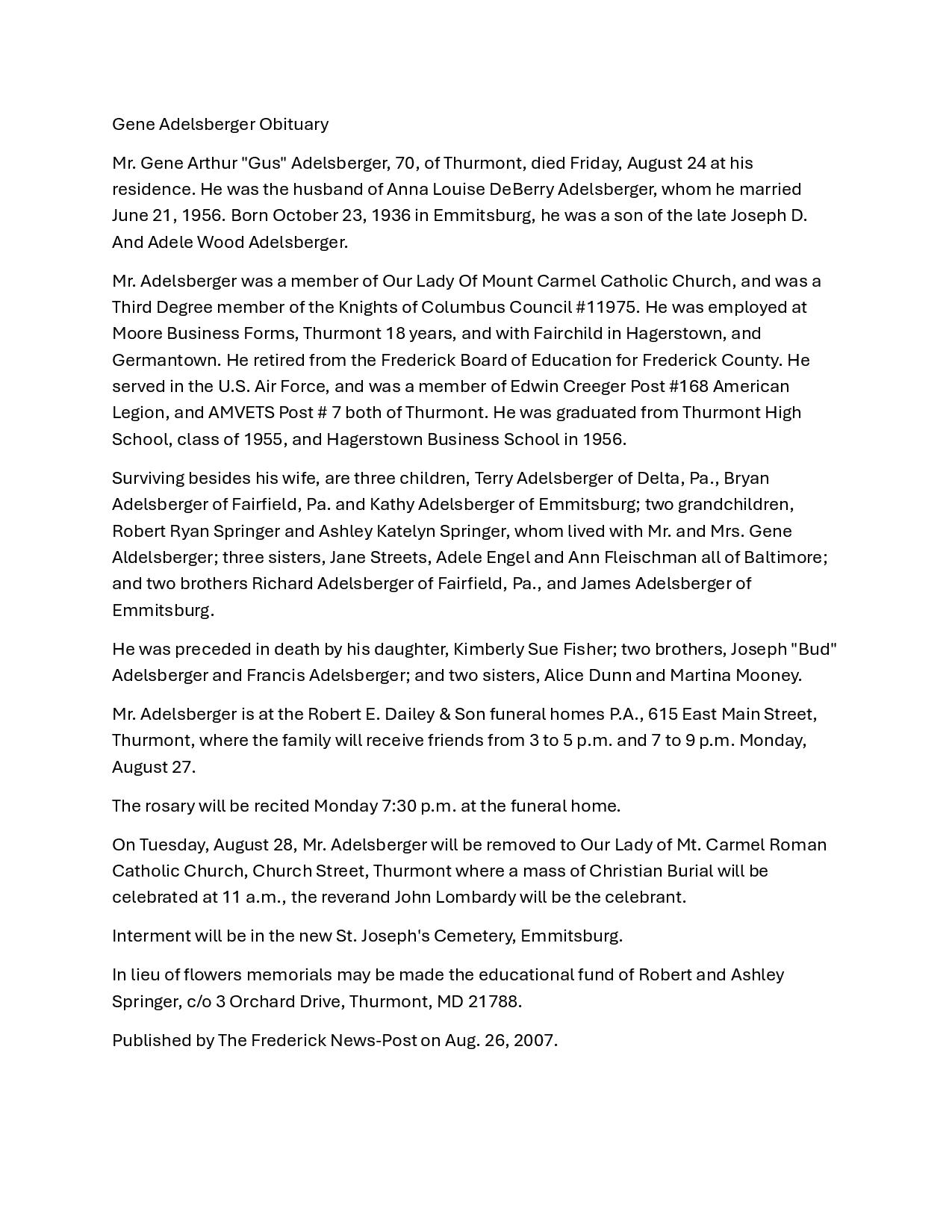 SK Gene Arthur “Gus” Adelberger, Born 23 Oct 1936 in Emmitsburg, MD. Died 24 Aug 2007 in Thurmont, MD. Buried in New St. Joseph's Cemetery, Emmitsburg, MD. Findagrave 154726350.