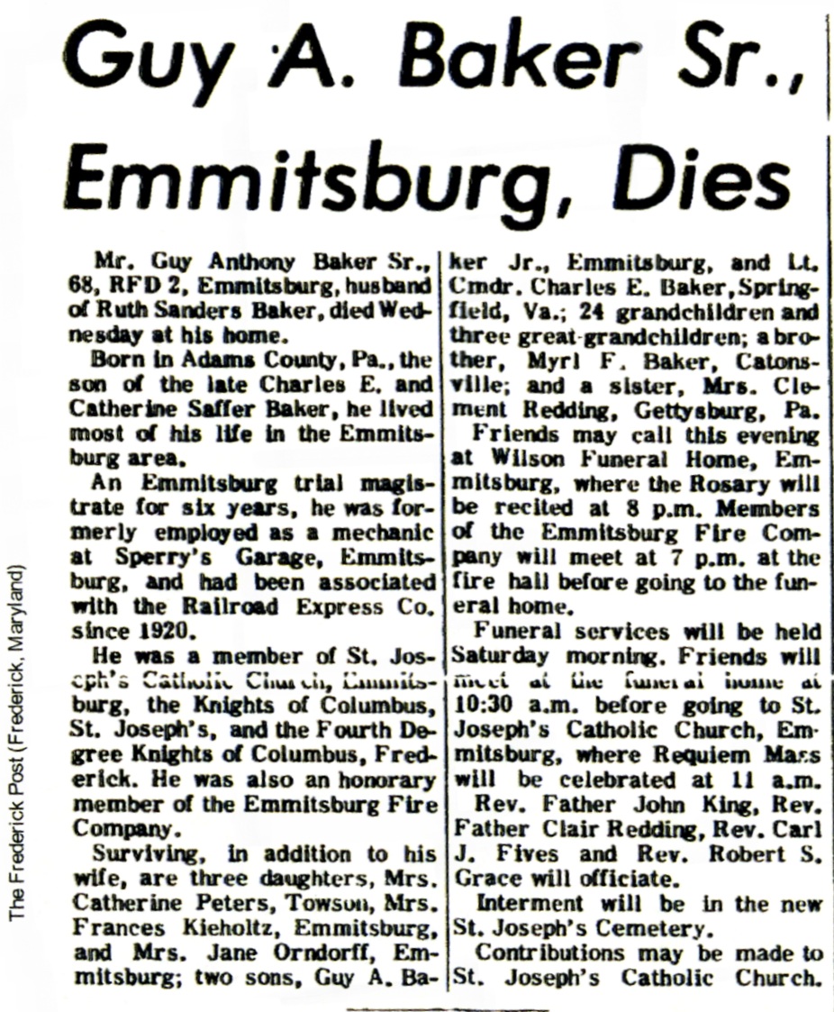 SK Guy Anthony Baker, Sr., Birth 21 Oct 1903 in Adams County, Pennsylvania. Death 24 Nov 1971 (aged 68) in Emmitsburg, Frederick County, Maryland. Burial in New Saint Josephs Cemetery, Emmitsburg, Frederick County, Maryland. GPS-Latitude: 39.7007332, Longitude: -77.3279137. Findagrave 32119251.