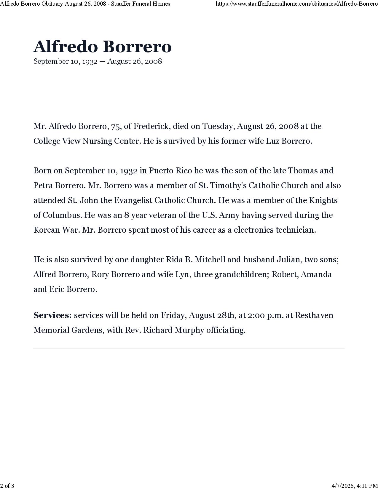 SK Alfredo P Borrero, Birth 10 Sep 1932. Death 26 Apr 2008 (aged 75). Burial Resthaven Memorial Gardens, Frederick, Maryland.