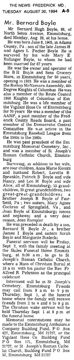 SK Bernard Hugh Boyle, Sr., Birth 8 Jun 1905 in Adams County, Pennsylvania. Death 29 Aug 1994 (aged 89) in Emmitsburg, Frederick County, Maryland. Burial in Saint Josephs Cemetery, Emmitsburg, Frederick County, Maryland.