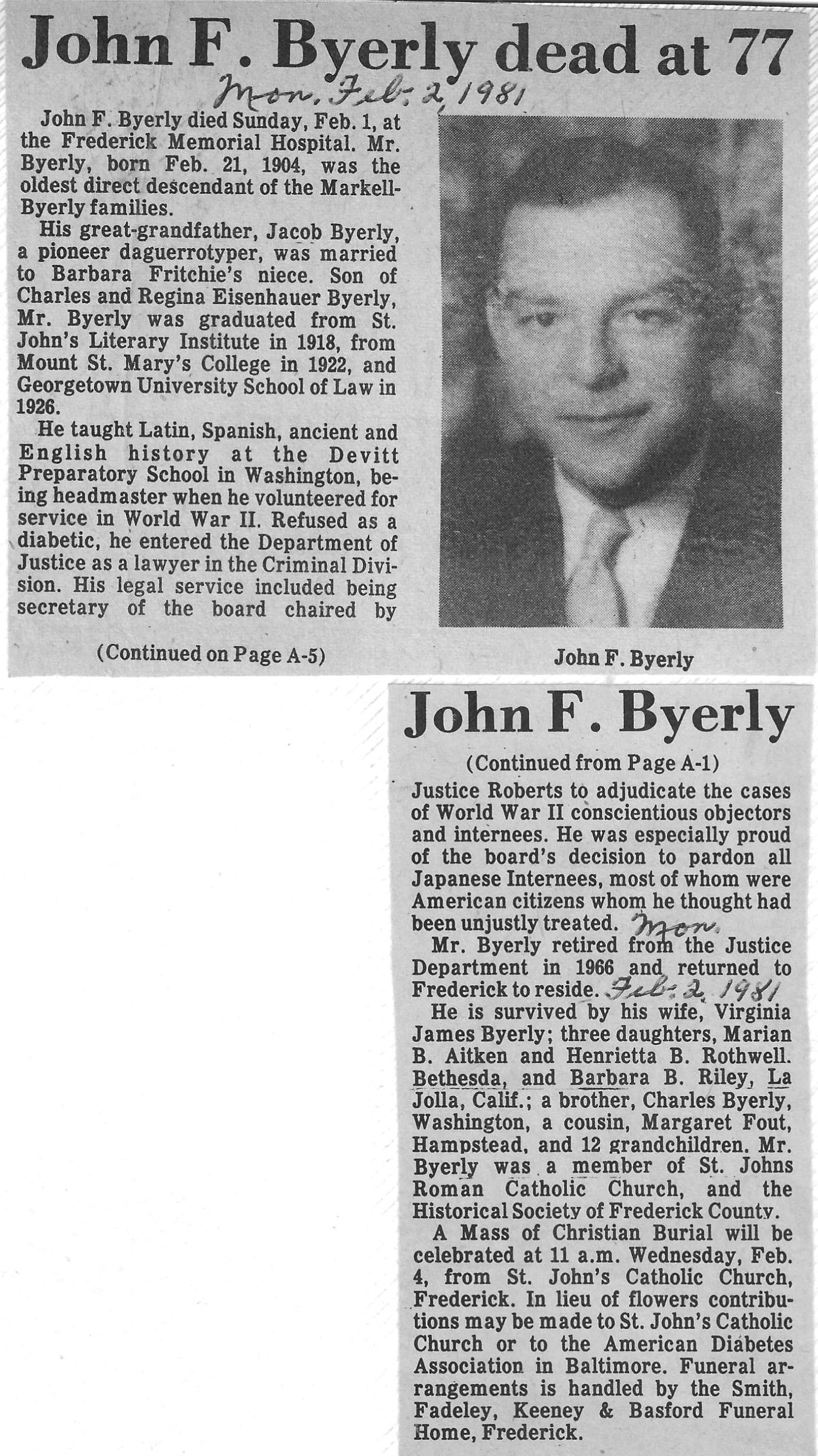 Br. John Richard “Jack” Baer , Birth 3 Oct 1908 in Frederick, Frederick County, Maryland. Death 24 Nov 1989 (aged 81). Burial in Mount Olivet Cemetery, Frederick, Frederick County, Maryland, GPS-Latitude: 39.4014458, Longitude: -77.4172882, Plot Area AA, Lot 26, Grave 6. Findagrave 233947098.