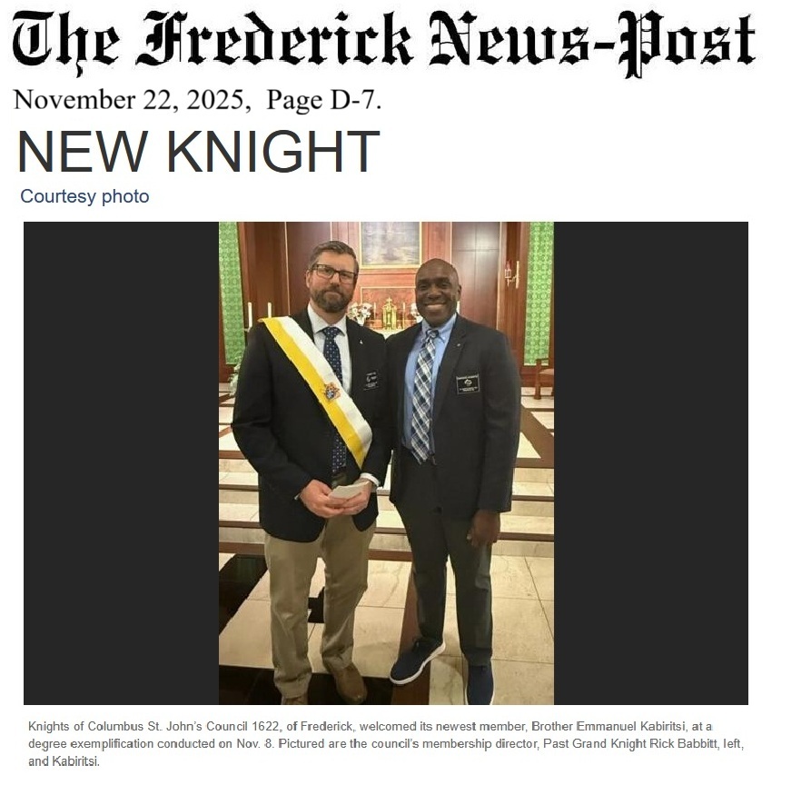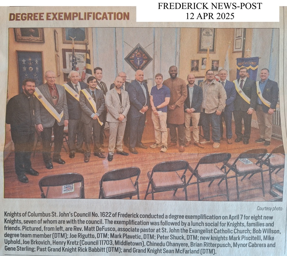 On the morning of Sunday, April 7, 1912, the first group of men of St. John the Evangelist Church in Frederick, Maryland met for the purpose of organizing a new Council. A short time later, the required number of candidates was obtained and a petition for a charter was made to the Supreme Office by State Deputy P.C. Mueller.