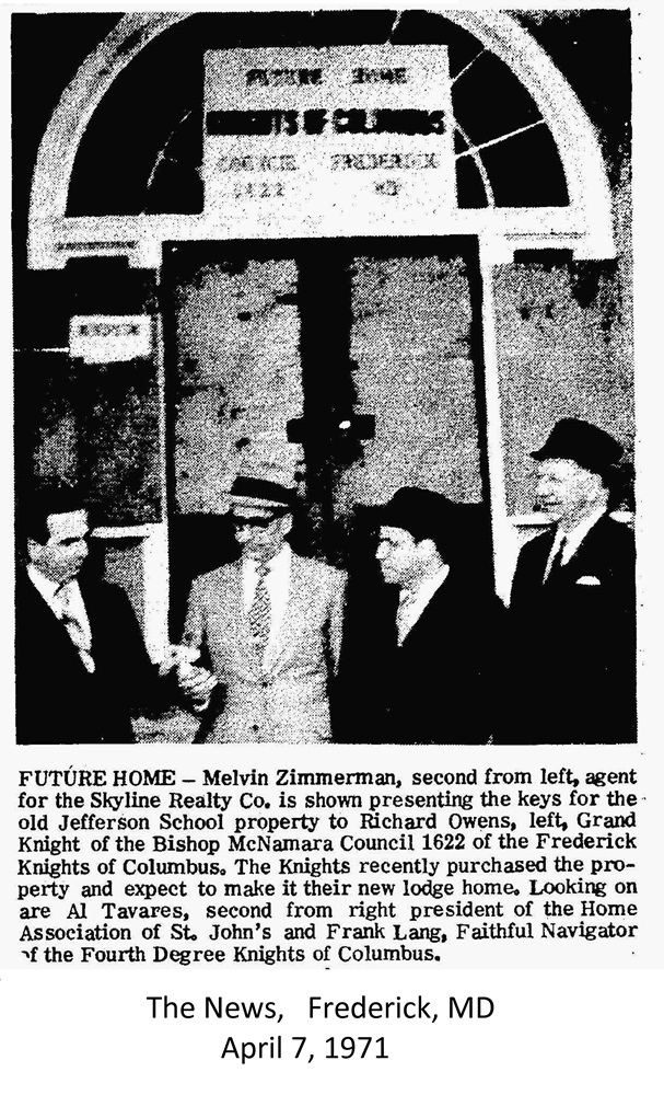 April 7, 1971. Newspaper article regarding St. John's Council purchacing the old Jefferson School building in Jefferson, MD.