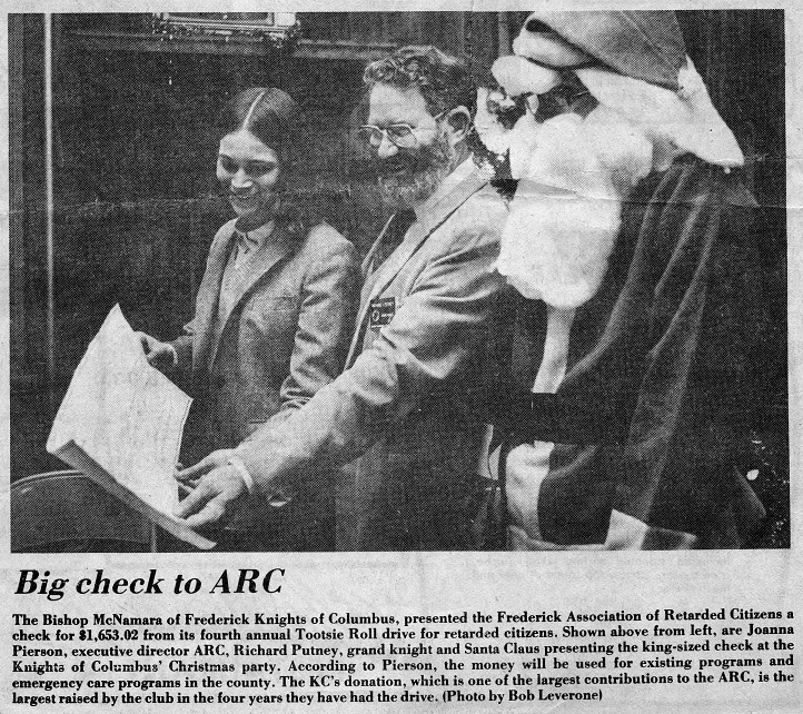 December 1981 - Bishop McNamara Council presents check for $1,653 to ARC of Frederick from it's fourth annual Tootsie Roll Drive for the Intellectually Challenged.