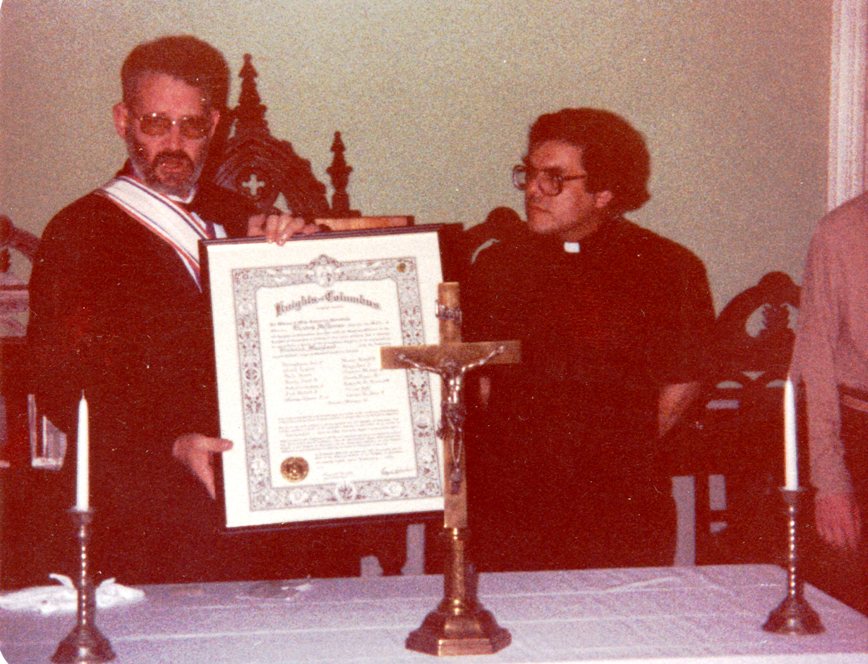 1981 or 1982 - Squires Circle installation of officers: Grand Knight Richard Putney and Fr. Ronald Carillo hold charter for Squires Circle.