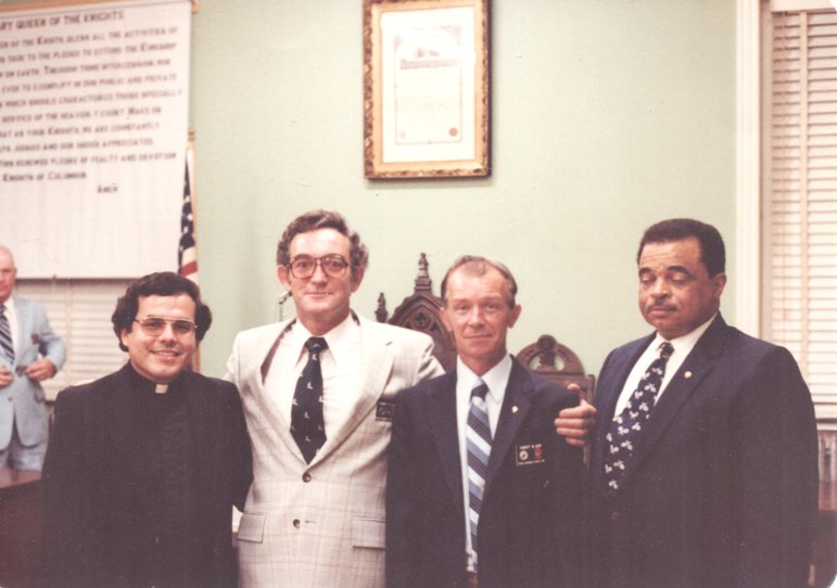 July 1982 - Bishop McNamara Council #1622 installation of officers in the council chamber at 16 W. 7th Street, Frederick, MD. (LtoR) Fr. Ronald Carillo, Br. Seamus P. Clancy, Br. Robert Jack, and Grand Knight William Brown.
