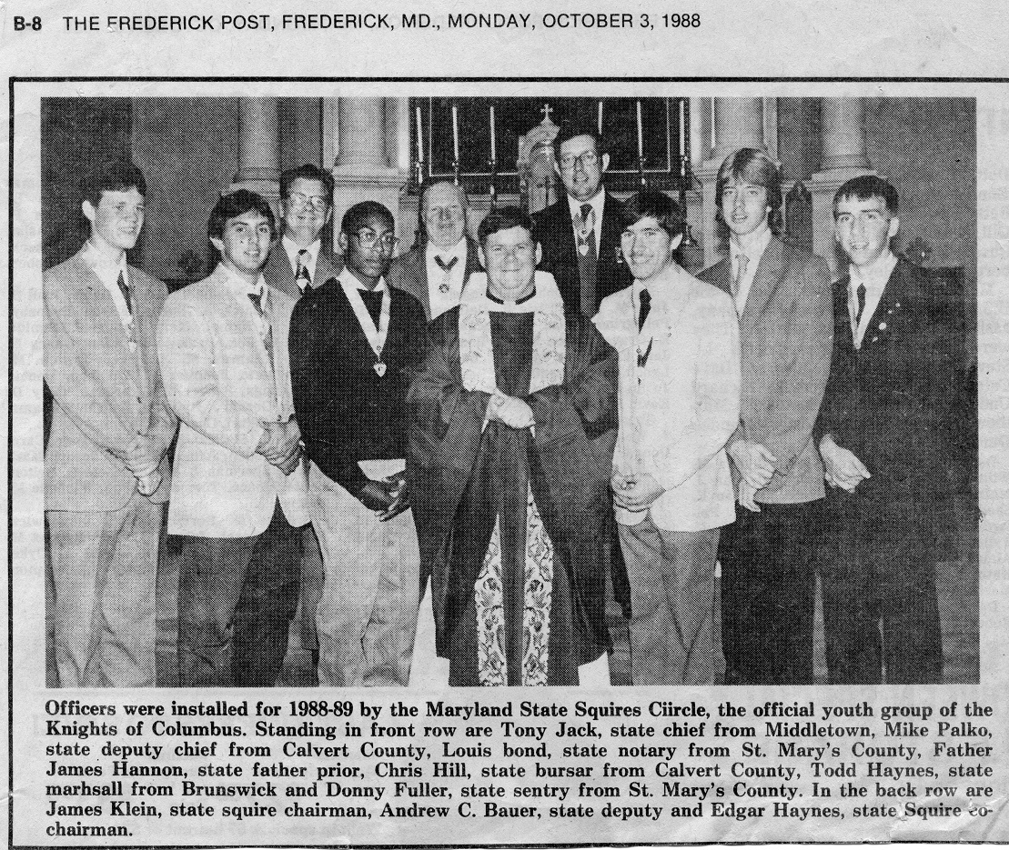 October 03, 1988 Frederick News Post Article - Maryland State Squires Circle - Installation of Officers at St. John the Evangelist Chruich in Frederick, MD.