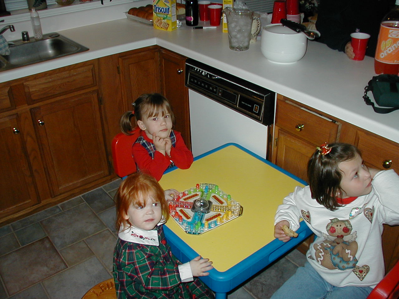 Young ones playing "Pop-omatic Trouble" in the kitchen.