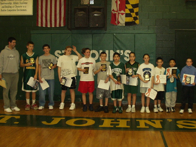 The Bishop McNamara Council 1622 Knights of Columbus held a Free Throw contest on January 25, 2004 at Saint John's at Prospect Hall. There were over 30 contestants in all age categories who participated in the contest. Congratulations to the following students who won their age category: Emily Kinley, Girls age 10; Bobby Ordonio, Boys age 10; Melany Rowley, Girls age 11; Jude Merkel, Boys age 11; Kylie Late, Girls age 12; Brian Roby, Boys age 12; Katie Oliverio, Girls age 13; Andy Wilkinson, Boys age 13; Joan Bartgis, Girls age 14; and Aaron Middeke, Boys age 14. The winners advanced to the Knights of Columbus District contest held on February 28, 2004. A special thanks to Brother Jeff Balistrere for organizing and running the Free Throw Contest.