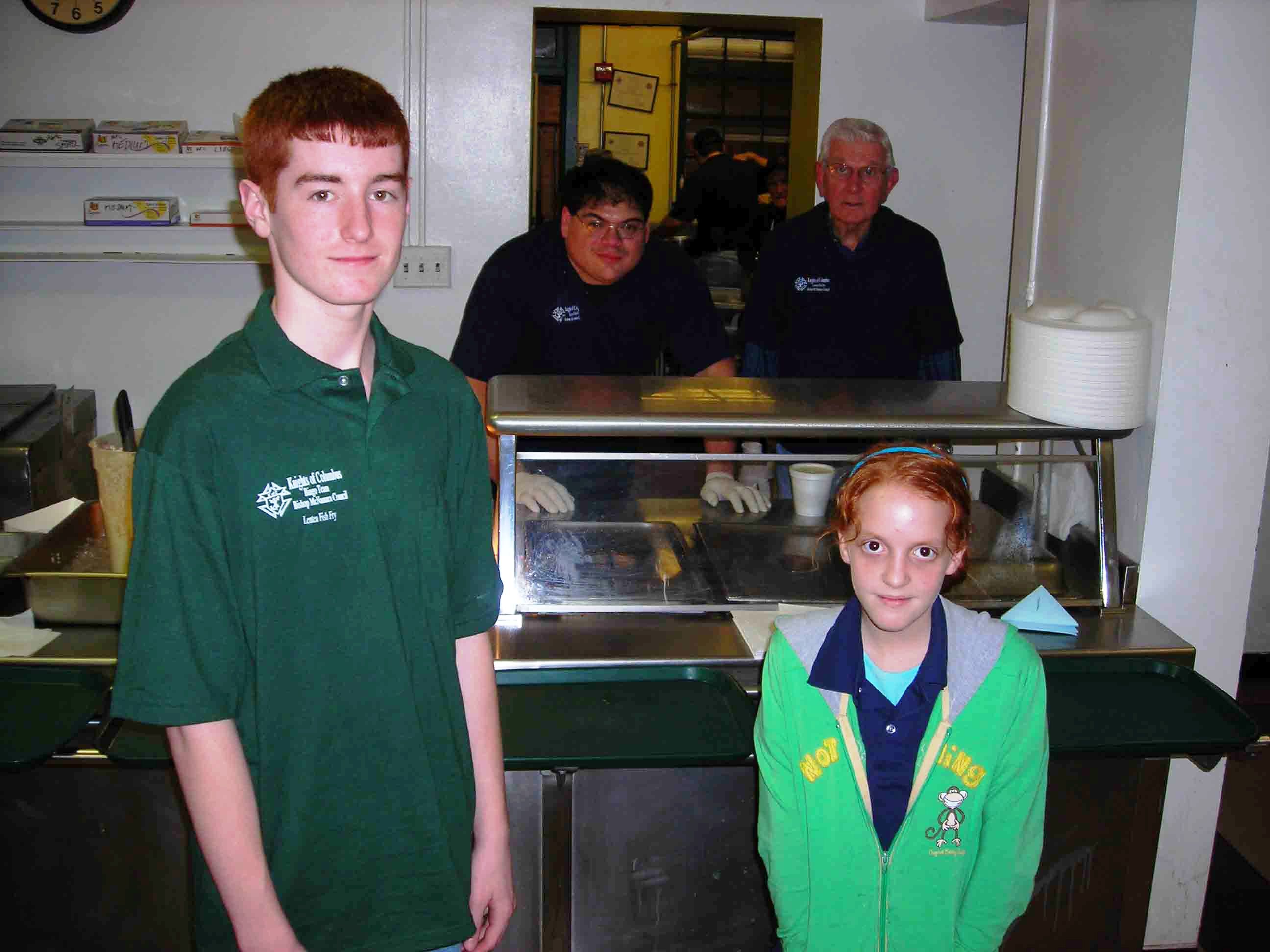 (Rear - LtoR) Br. Matt Coccagna and Br. Ed Kuzas preparing dinners (rear). (Front) Jake Sabatano and Rebecca Czarnecki waiting tables.