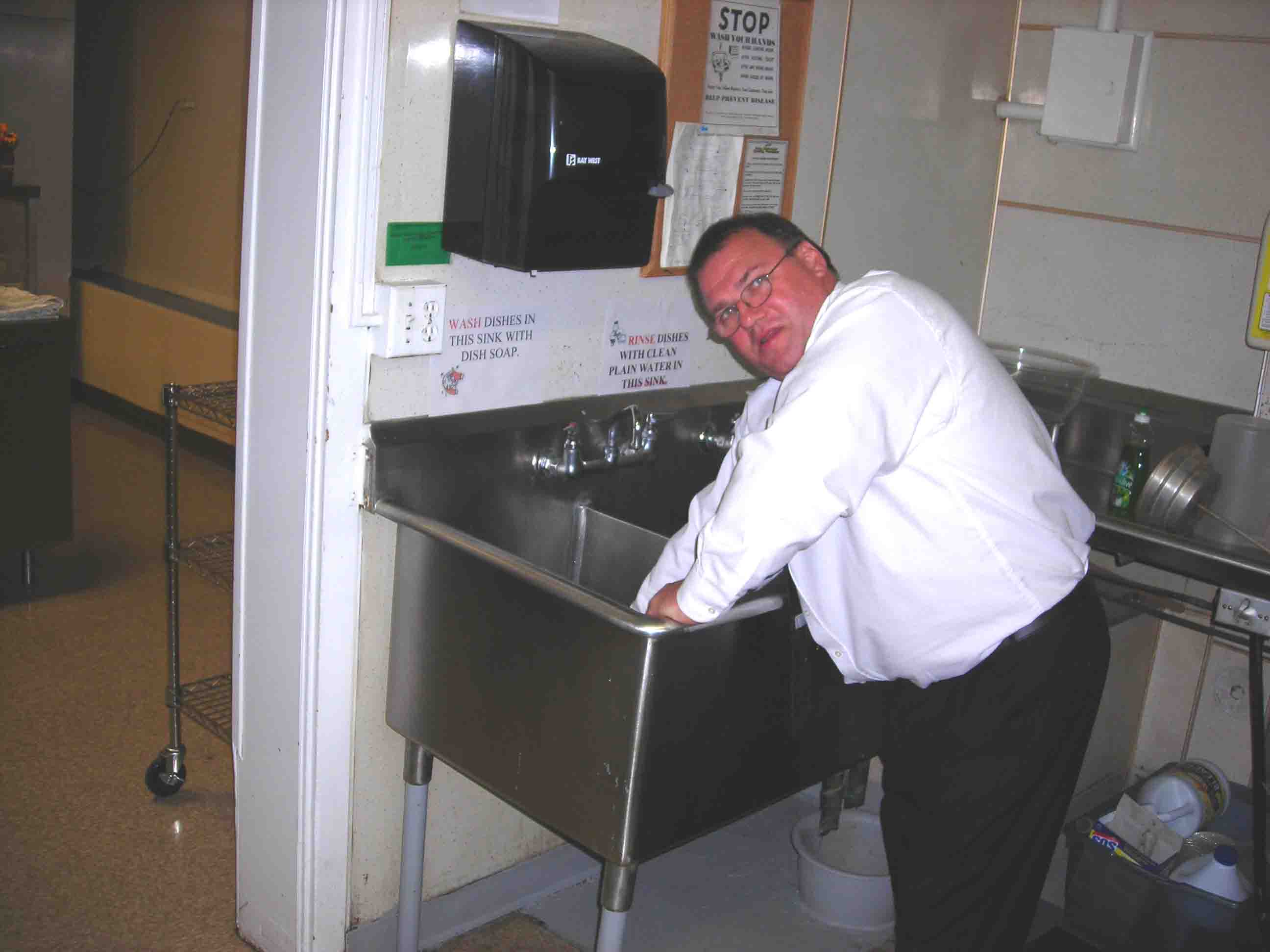Reception: (LtoR) Br. Larry Lindner scrubbing pans in the kitchen.