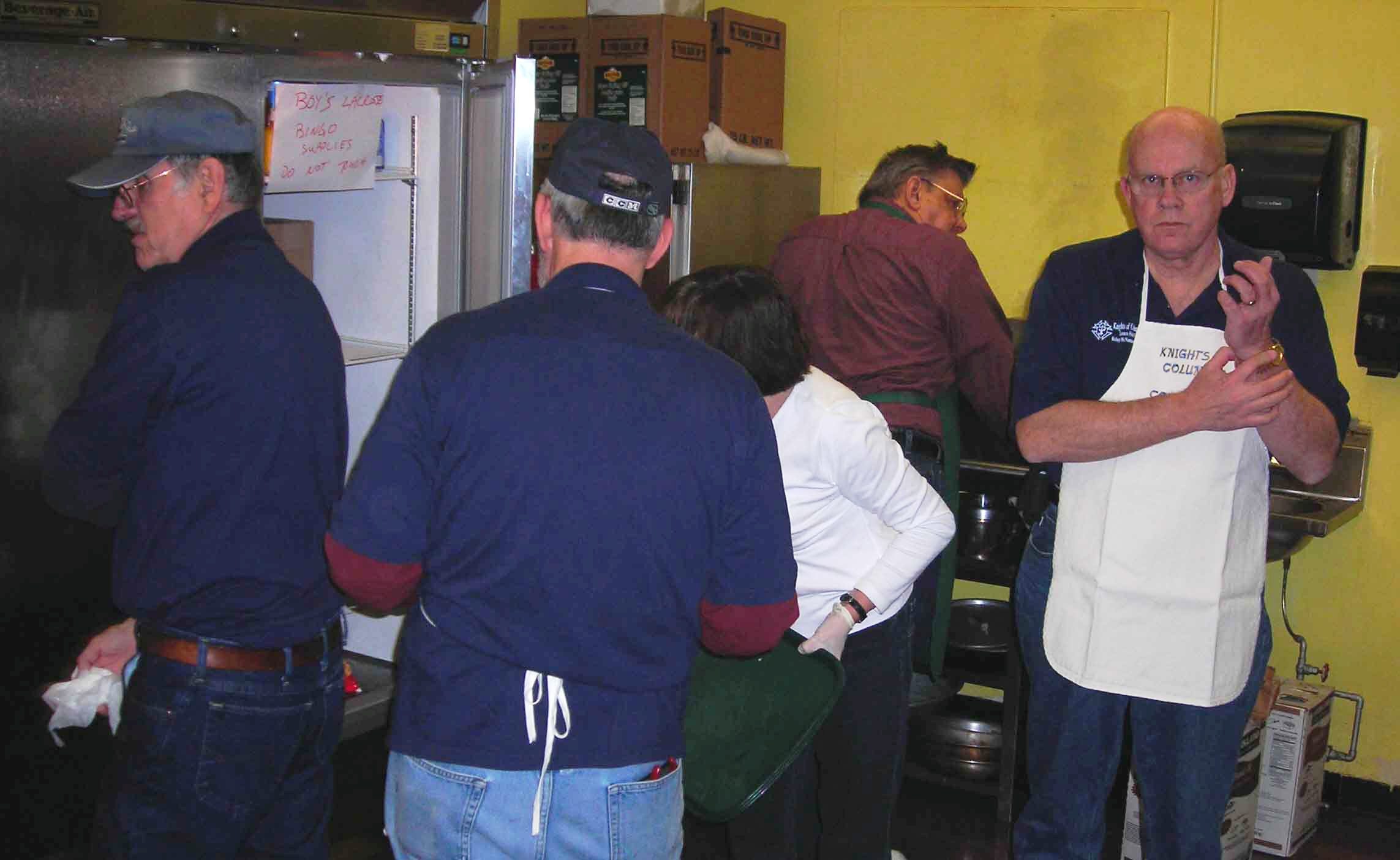 Preparing fish in the kitchen. (LtoR) Br. Jim Schneck, Br. John Satterfield, Ellen Satterfield, GK Bill Wierzbicky and Br. Mike Collins setting up.
