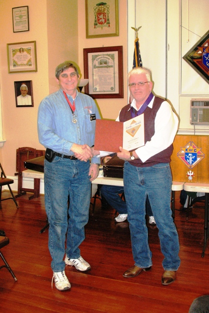 Rick Casazza presents the Family of the Month award to Jim Shabelski during the social meeting on 1/4/10. Jim and Ann Marie were recognized for their efforts in making SHARE meal distributions over the holidays, in spite of the adverse weather conditions.