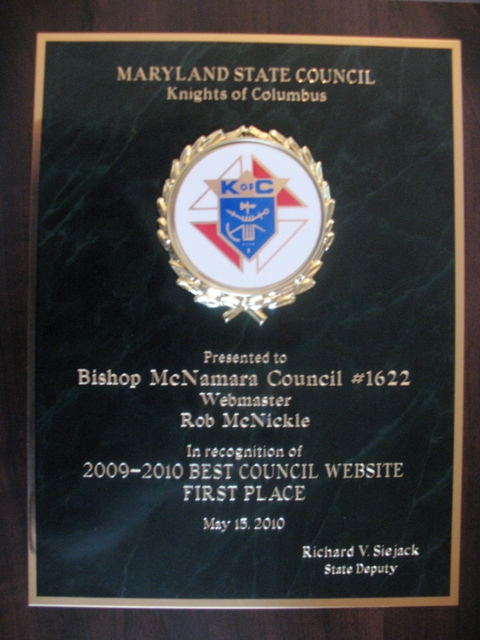 The "Best Council Website" award, which was awarded to our Council during the 2010 Maryland State Convention on May 15th in Ocean City, MD. Webmaster was Br. Rob McNickle.