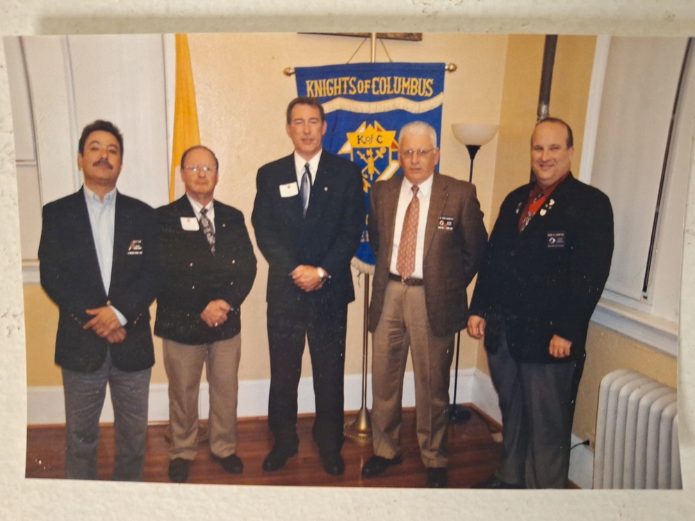 (LtoR) Deputy Grand Knight Jose Rector, new Knight Br. Sheldon Shealer, new Knight Br. John Nalley, Grand Knight Rick Casazza, and District Deputy Dirk Griffin (Cncl 12255).