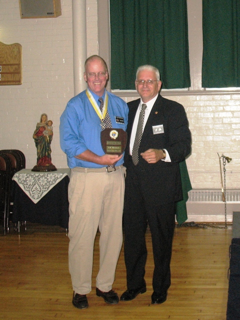 Outgoing Grand Knight Rick Casazza presents the Knight of the Year award to Br. Rob McNickle at the Installation dinner. The Installation of Officers ceremony was held at St John the Evangelist Church on July 29, 2011.