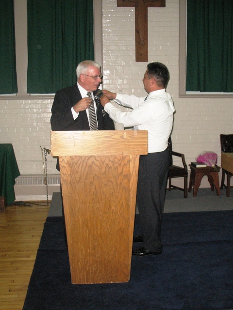 Incoming Grand Knight Jose Rector pins Outgoing Grand Knight Rick Casazza at the Installation dinner. The Installation of Officers was held at SJE on July 29, 2011.