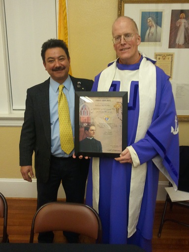 (LtoR) Grand Knight Jose Rector presents a Degree Honoree Certificate to Br. Rob McNickle.