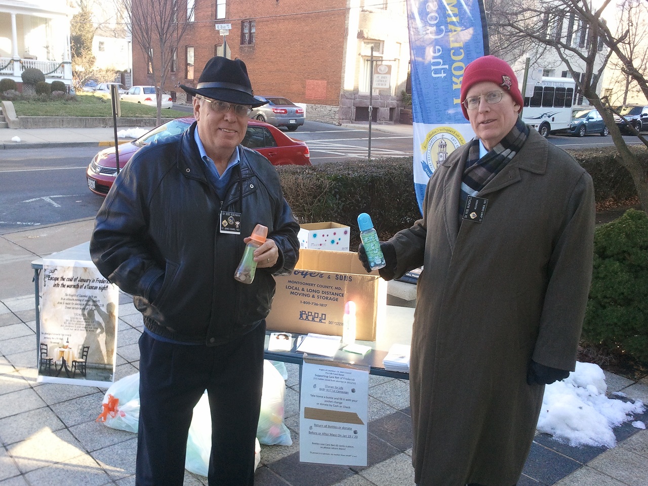 Jan 6, 2013, Br. Bob Boehman and Br. Rob McNickle distribute baby bottles at St. John's for pro-life fundraiser.