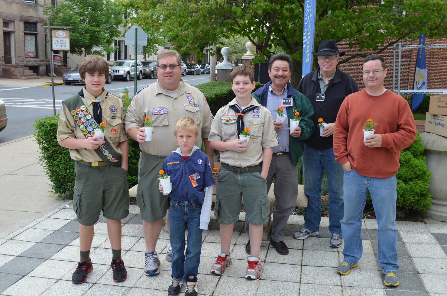 Jun 11, 2013, Boy Scouts assist Knights in distributing Pro-life Marigolds to parish mothers on Mother's Day.