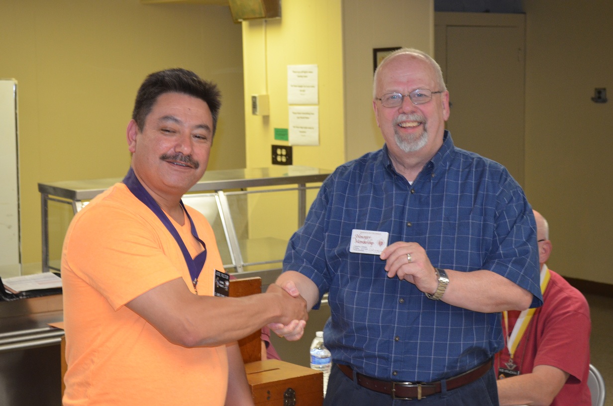 June 17, 2013, Grand Knight Jose Rector presents an "Honorary Membership" card to Br. Joe Swiss for 25 years of service as a Knight during a St. John's Council Meeting.