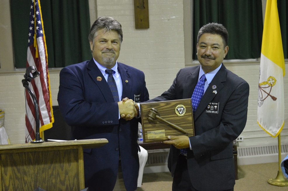 Incoming Grand Knight Tom Plunkett (L), presents award to Outgoing Grand Knight Jose Rector (R).