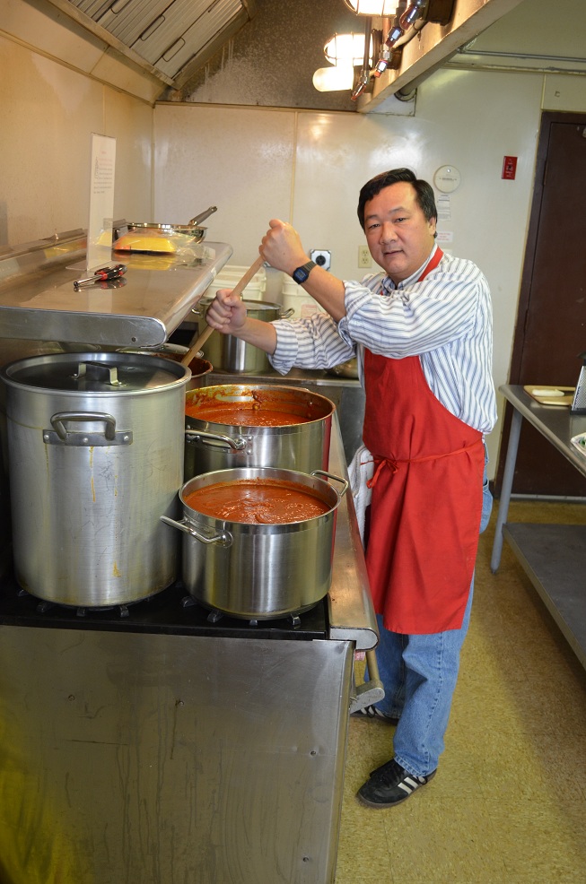 Deputy Grand Knight Marice Wong preparing sauce.