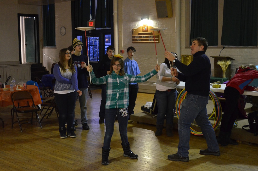Entertainment: Br. Mark Lohr teaches juggling skills to a nervous assistant.