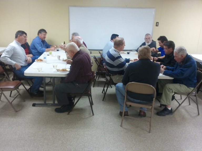 Enjoying a plate of spaghetti and fraternity after their work is done.