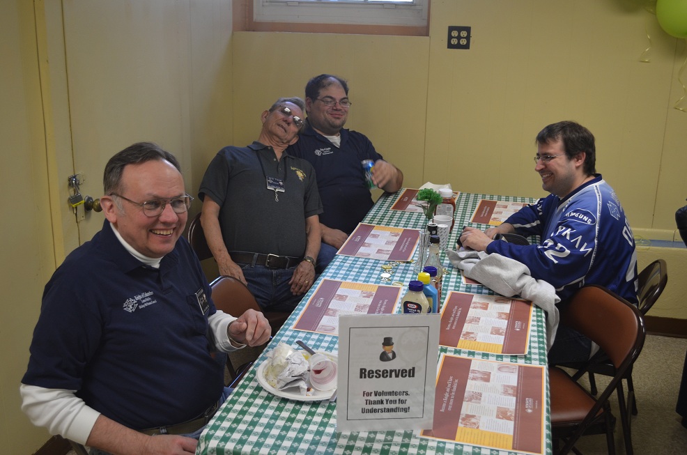 2014-0314 Fish Fry. Workers take a break. (LtoR) Br. Matt Meadows, Br. Pete Tokar and Br. Matt Coccagna, accompanied by Br. Chris Shumway.