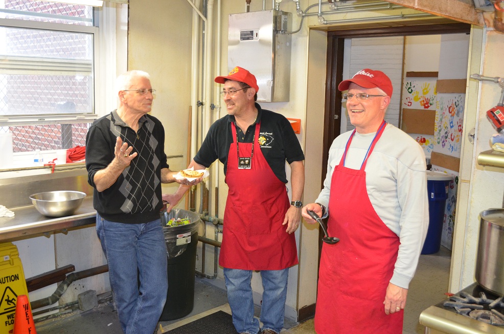 (LtoR) Fish Fry Chairman PGK Rick Casazza, Kitchen Manager Br. Dave Spuck and Br. Bob McDonnell chatting in the kitchen.