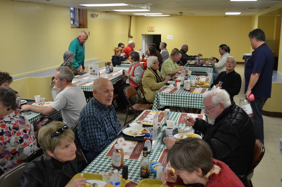 Customers busy enjoying their meal. Note Br. Deacon Dan Roff (one of our Council 1622 Associate Chaplains) half way down on the right, talking with our Grand Knight Tom Plunkett who is selling 50/50 raffle tickets.