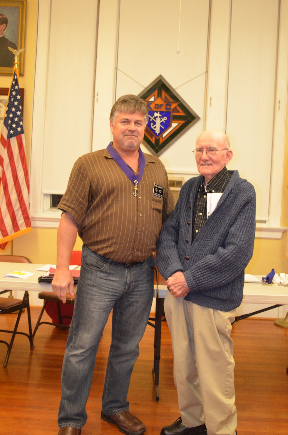 (LtoR) Grand Knight Tom Plunkett thanks Past Grand Knight Dick O'Connor for his many years of service.