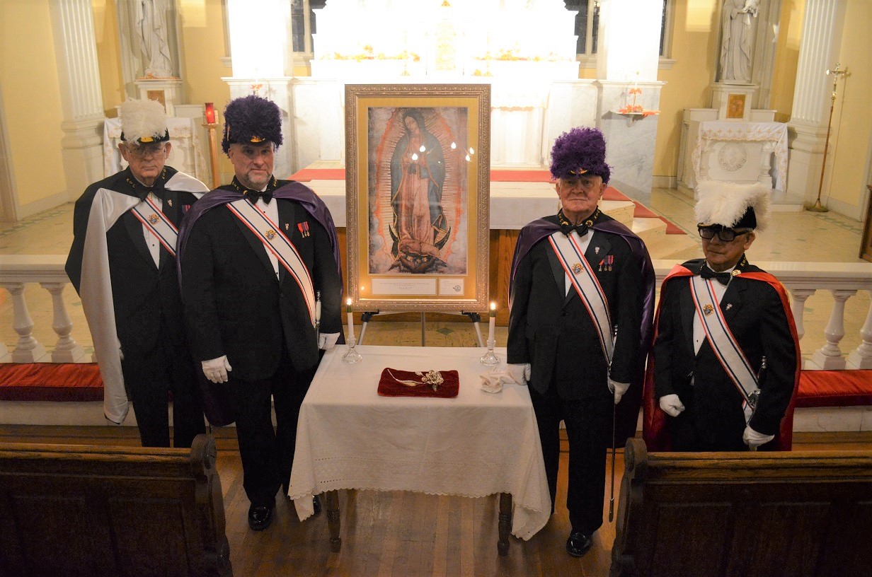 (LtoR) Bishop McNamara Assembly Color Corps PGK PFN Bob Morrow, PGK PFN Dirk Griffin, Color Corps Commander PGK PFN Bob Jack, SK Reddi Cerezo, standing with the Silver Rose and print of Our Lady of Guadalupe.
