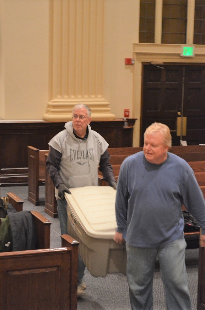 (LtoR) Br. Bob Boehman and Br. William Key bringing in a tree.