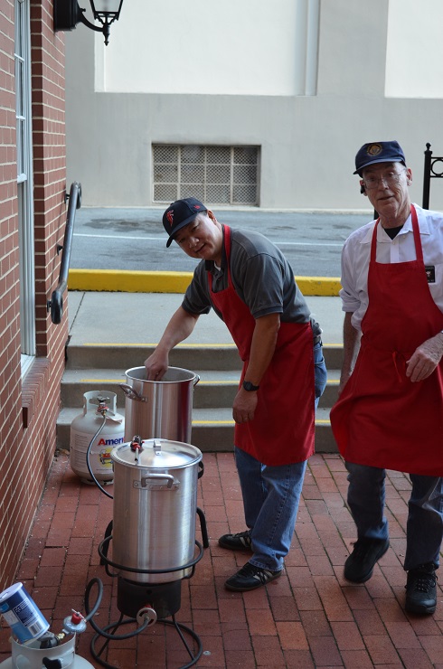 (LtoR) Br. Maurice Wong and Br. Tom McMahon preparing spaghetti sauce.