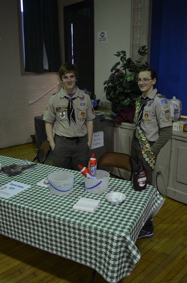 (LtoR) Boy Scouts sell ice cream sundaes.