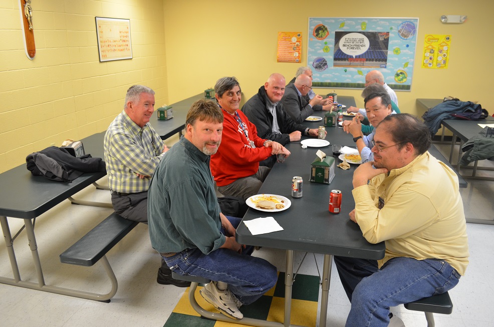 (LtoR) Br. Dave Vernot on left table. Left side of center table: Br. Jimbo Cooper, Br. Jim Schabelski, PGK Dave Zakrzwski (recently returned from exteneded work in Australia). Right side of center table: Br. Maurice Wong and Br. Matt Coccogna. Rear table is listed in next photo.
