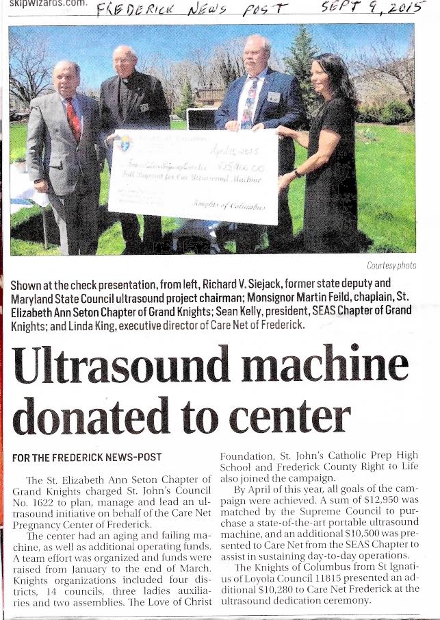 April 11, 2015. Overview: The Care Net of Frederick Ultrasound dedication and blessing ceremony. A team composed of the Knights of Columbus Ultrasound Initiative (Supreme), the Maryland State Council Ultrasound Initiative, the Saint Elizabeth Ann Seton (SEAS) Chapter of Grand Knights and supporting pro-life organizations in Frederick County raised funds to purchase a new portable ultrasound for Care Net of Frederick and to provide them with additional funds to sustain daily operations.