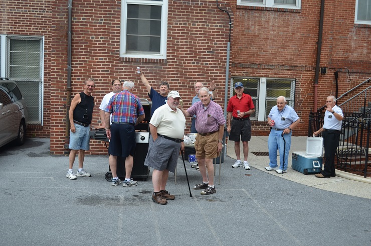 Pre-meeting cook-out (LtoR), Br. Pete Tokar, Br. Matt Coccagna, Br John Sivinski (facing other way, our grill chef), Grand Knight Tom Plunkett (with can), Br. Bill Desmond, DGK Bob Krajewski (partially obscured), PGK Dick Putney, Br. Jim Schneck, Br. Bill Barci and Br. Woody Johnston.