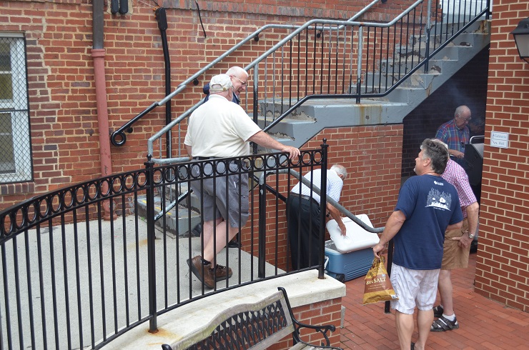 Pre-meeting cook-out (LtoR), carrying party indoors due to rain. Br. Bill Desmond, Deacon Doug Nathan, Grand Knight Tom Plunkett Br. Woody Johnston at cooler, PGK Dick Putney (hidden), and Br. John Sivinski (in rear at the grill).