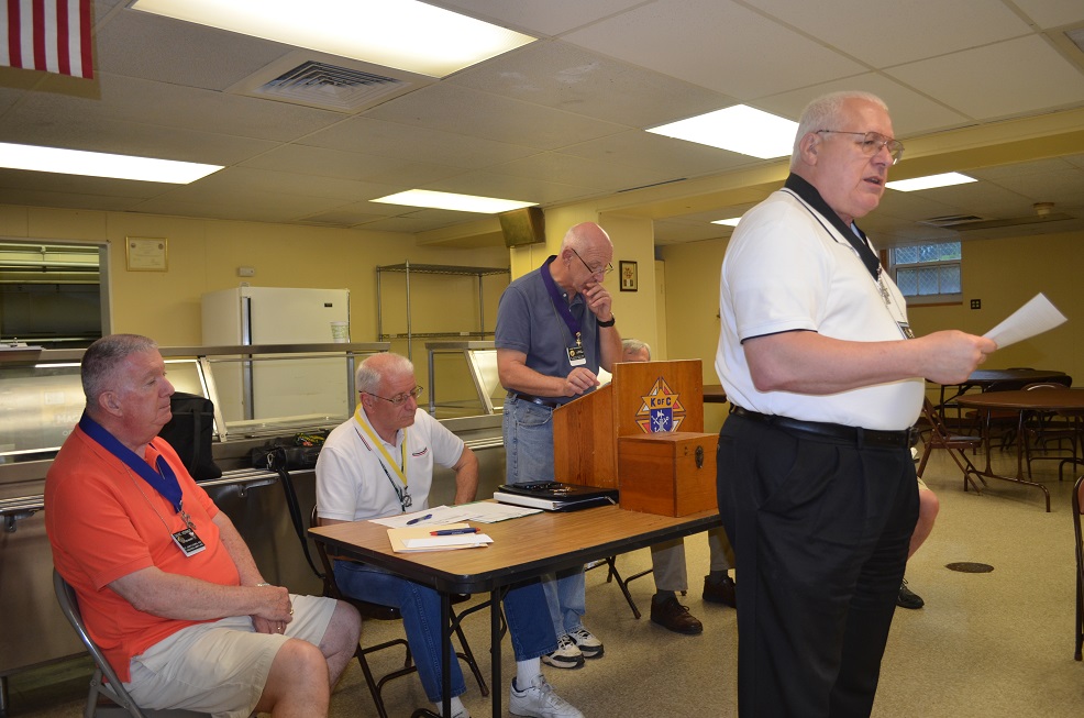 Associate Chaplain Deacon Doug Nathan addresses members. Head table (LtoR): Treasurer Br. Dave Vernot, Financial Secretary PGK Rick Casazza and Grand Knight Bob Krajewski,