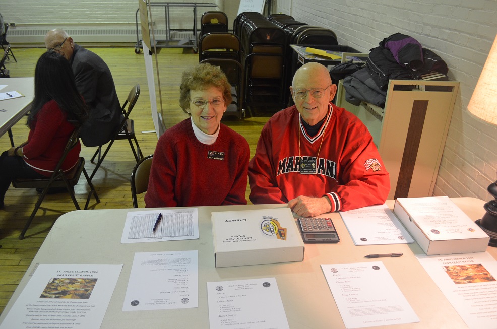 Kay Morrow and PGK Bob Morrow serve as cashiers. In rear, Karlene Wong and Grand Knight Bob Krajewski sell crab feast raffle tickets.