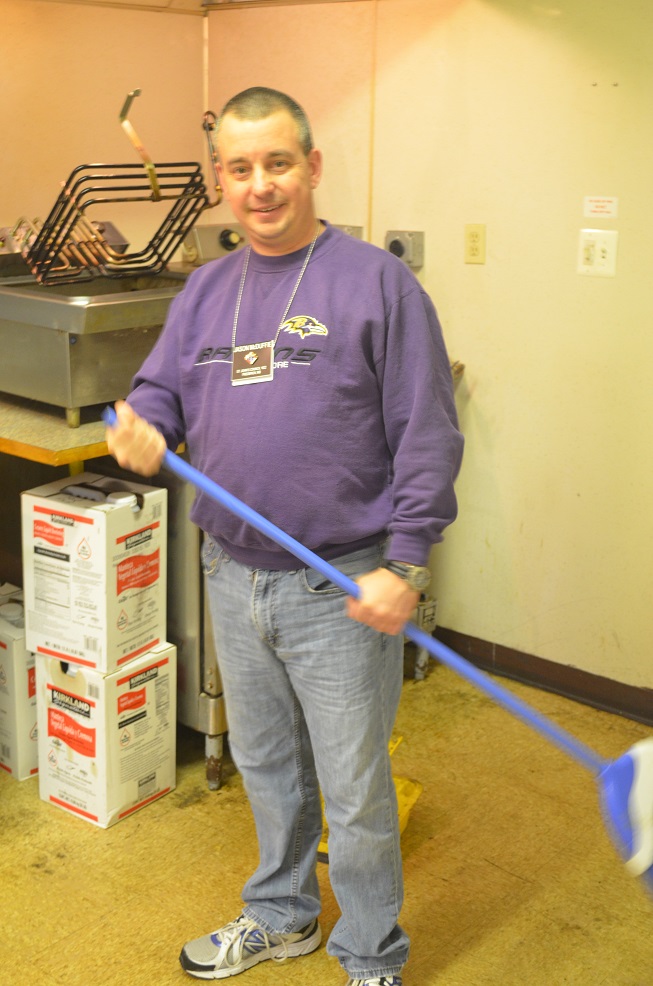 Br. Jason McDuffie sweeps the kitchen.